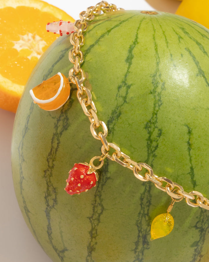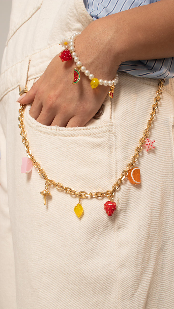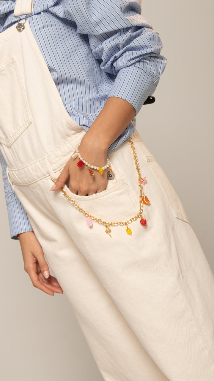 - Diseño multicharm que combina colores y texturas para un accesorio único y lleno de personalidad.