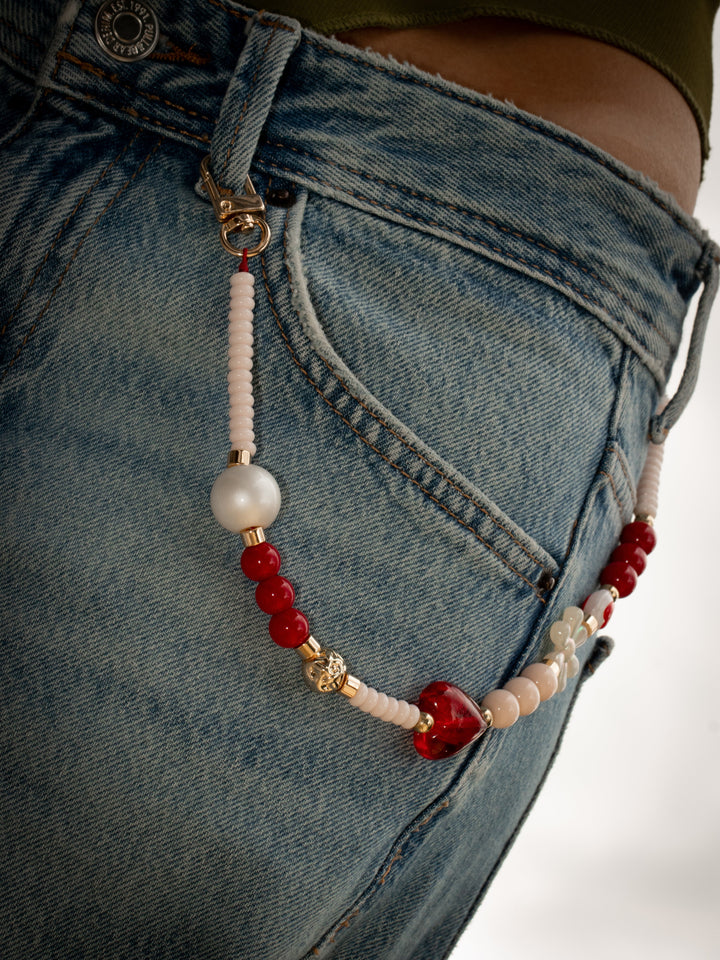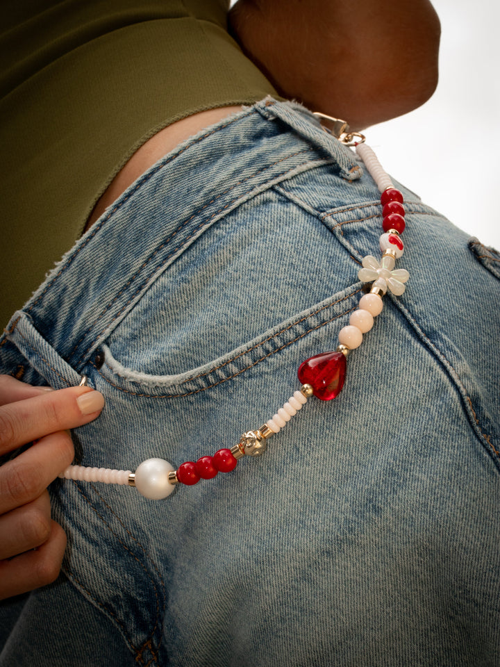 - Bagcharm elaborado con piedras de vidrio en tonos rojo y beige perlado.