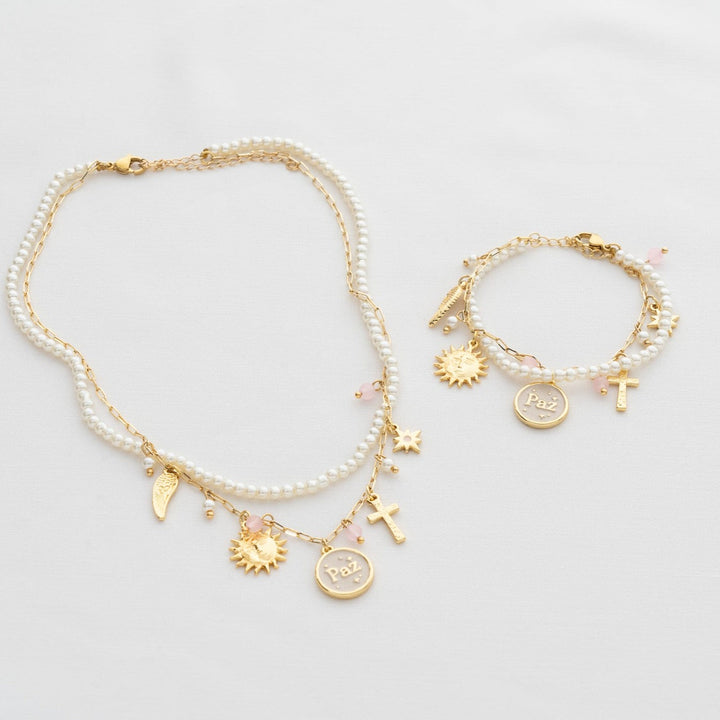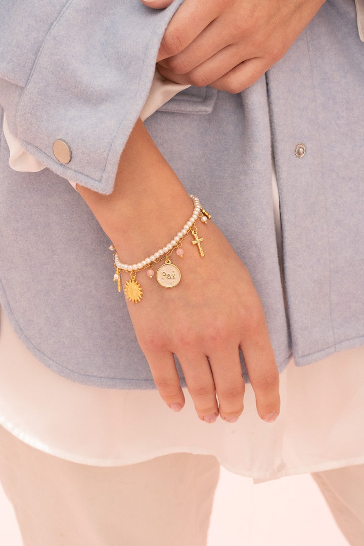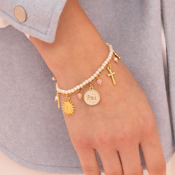 • Dijes de la pulsera en Zamak (aleación de metales) con baño de oro de 24k.