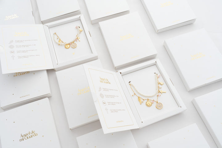 • Viene en caja divina con la oración del ángel de la guarda, cada dije representa una parte de la oración