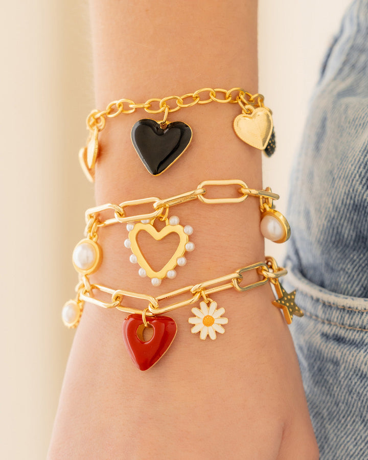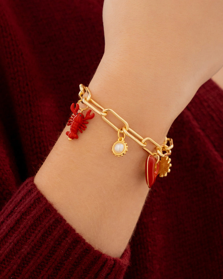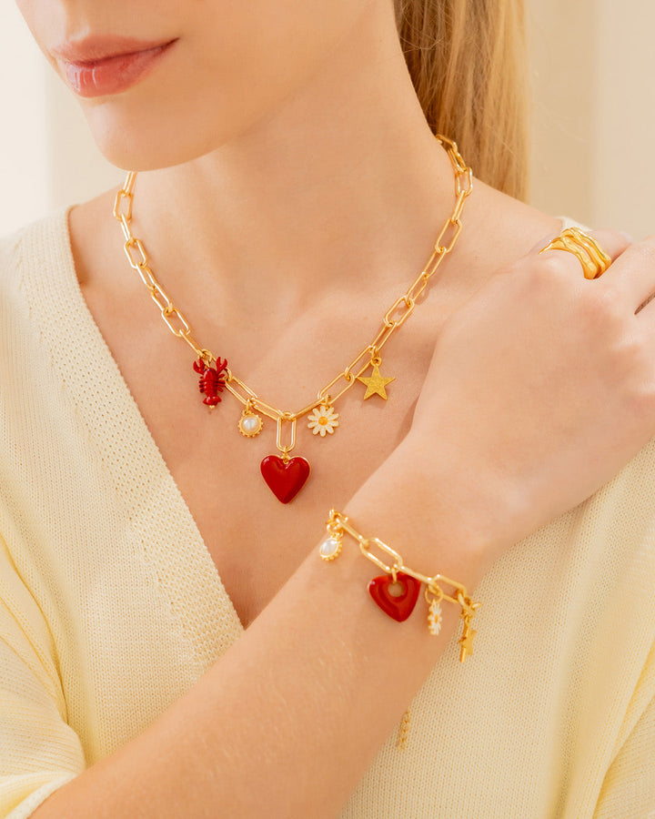 - Dijes de la pulsera en Zamak (aleación de metales) con baño de oro de 24k.