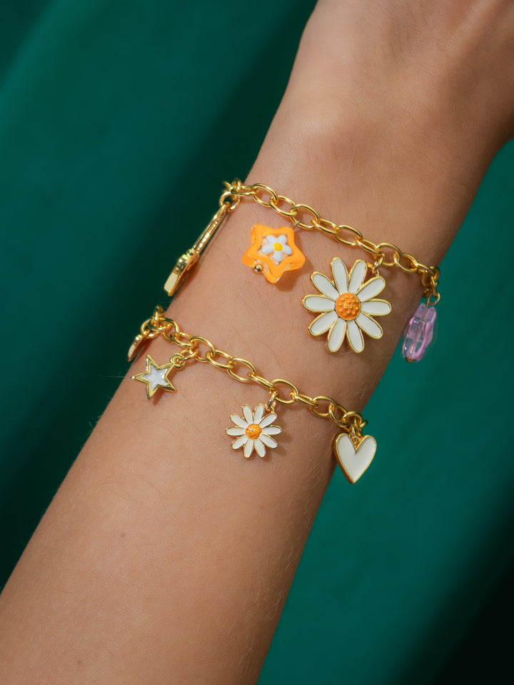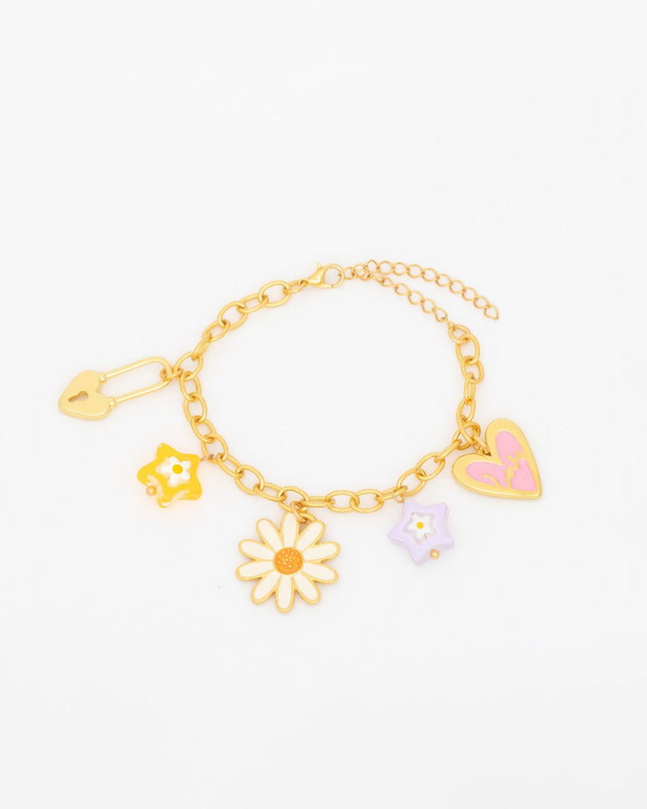 - Dijes de la pulsera en Zamak (aleación de metales) con baño de oro de 24k.