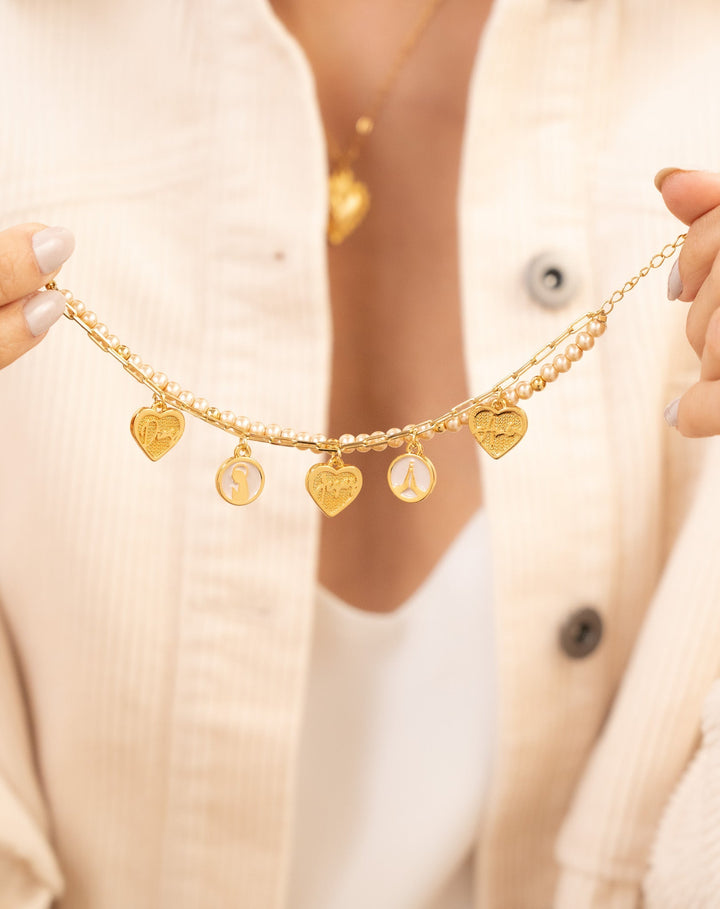 - Dijes de la pulsera en Zamak (aleación de metales) con baño en oro de 24K.