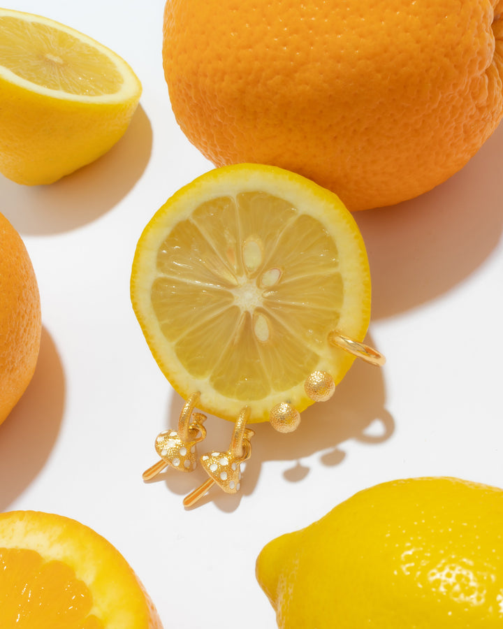 - Incluye: 1 par de candongas con dije de hongo, 1 par de topos y 1 earcuff.